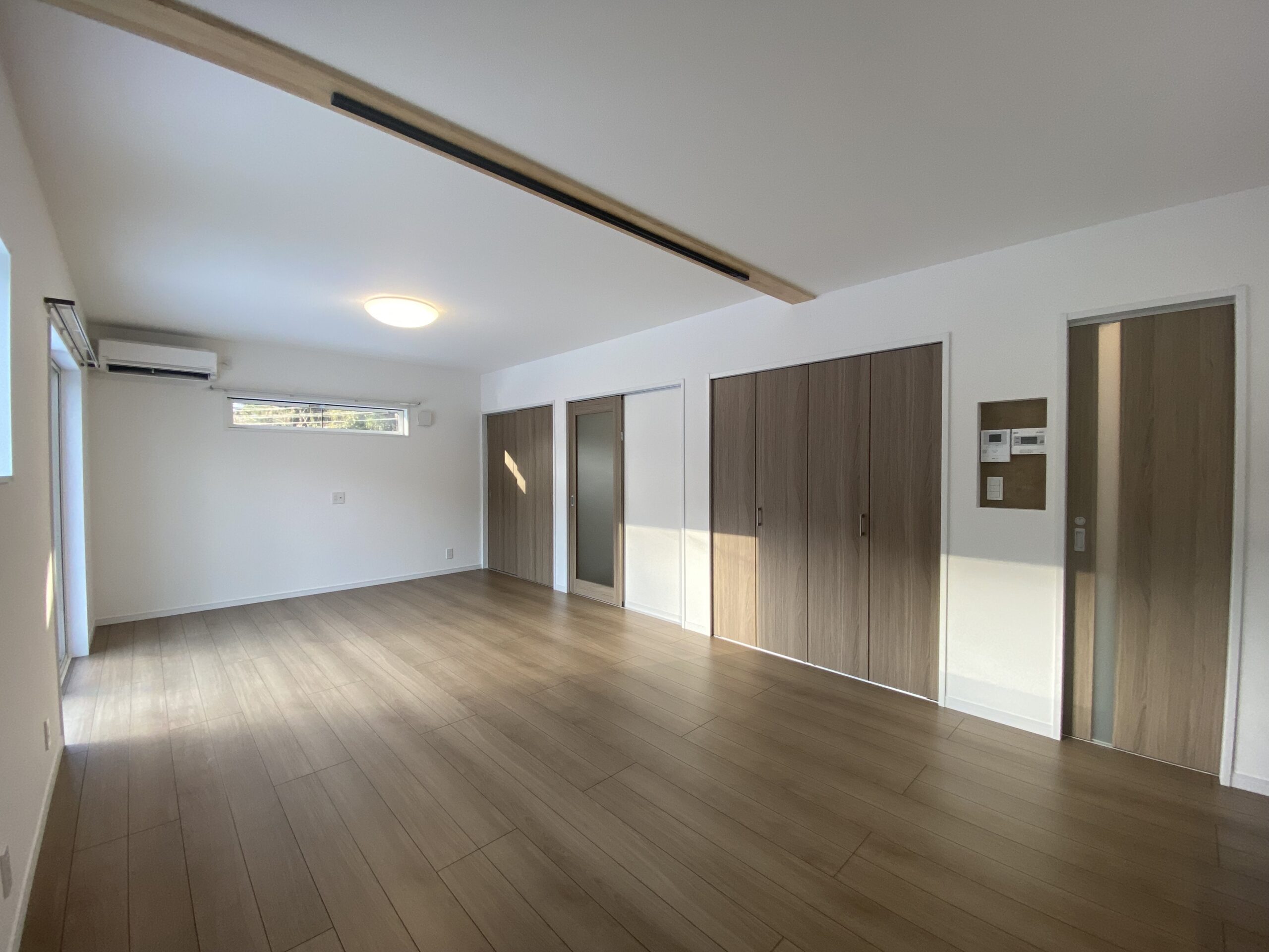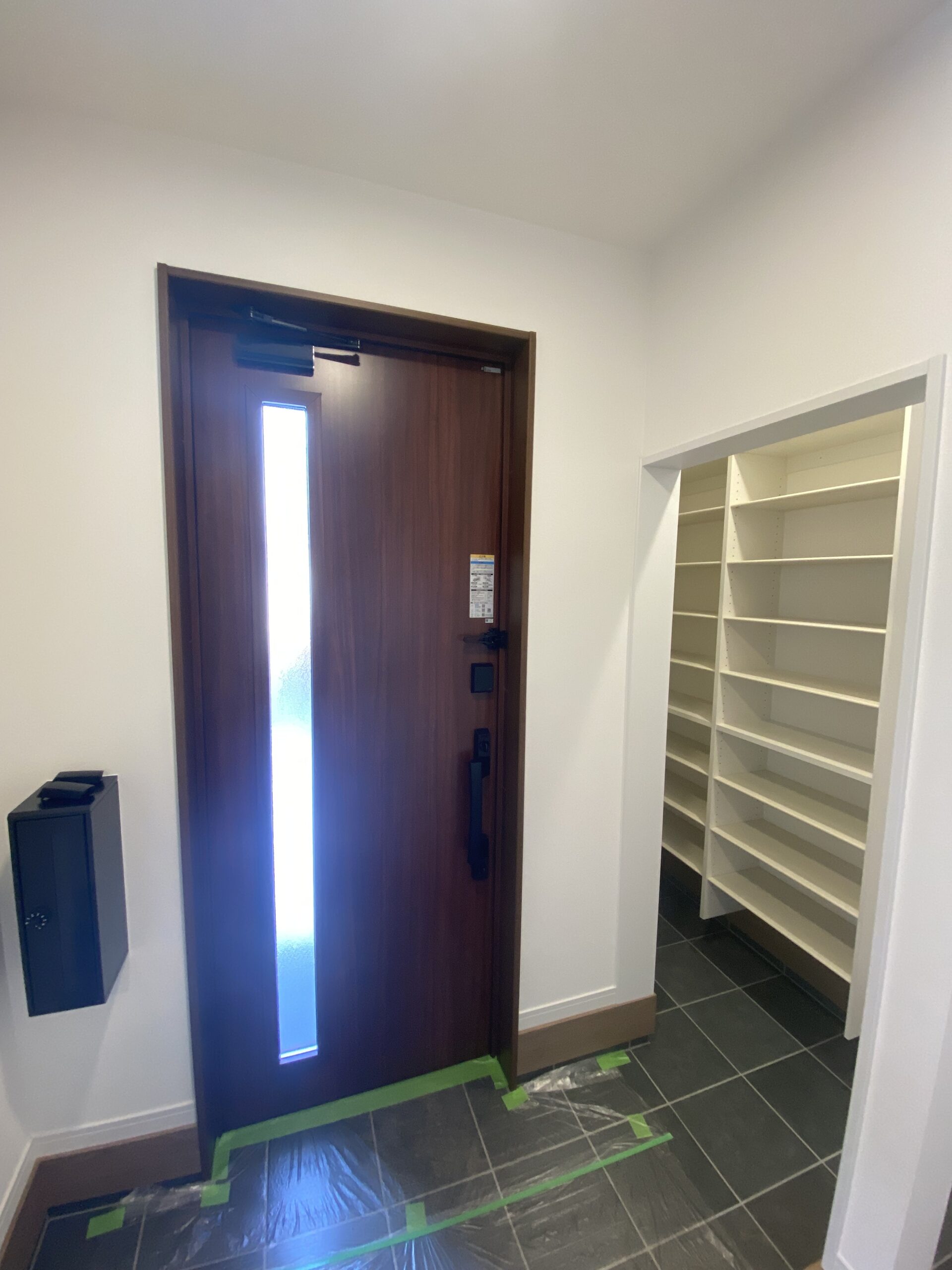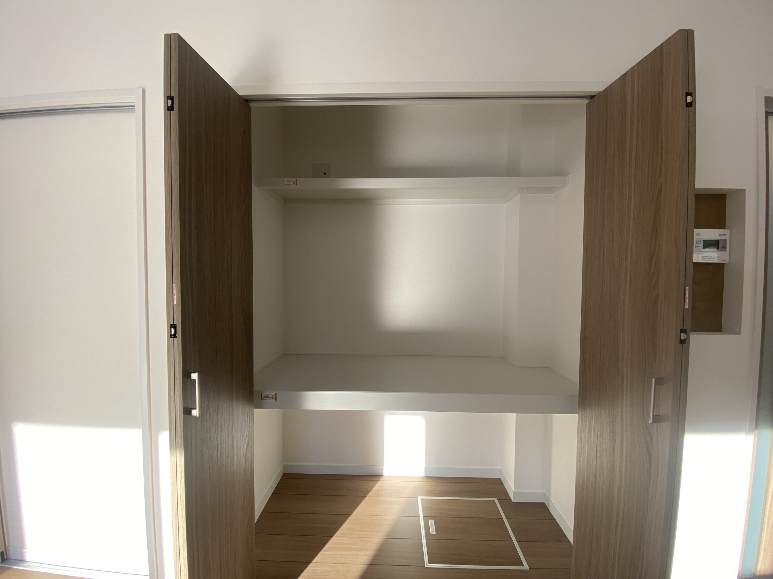 玄関横には広々としたシューズクロークを設置。靴はもちろん、コートや外出用品、季節物までまとめて収納できます。玄関まわりが散らかりにくく、来客時も気持ちよく迎えられる空間です。