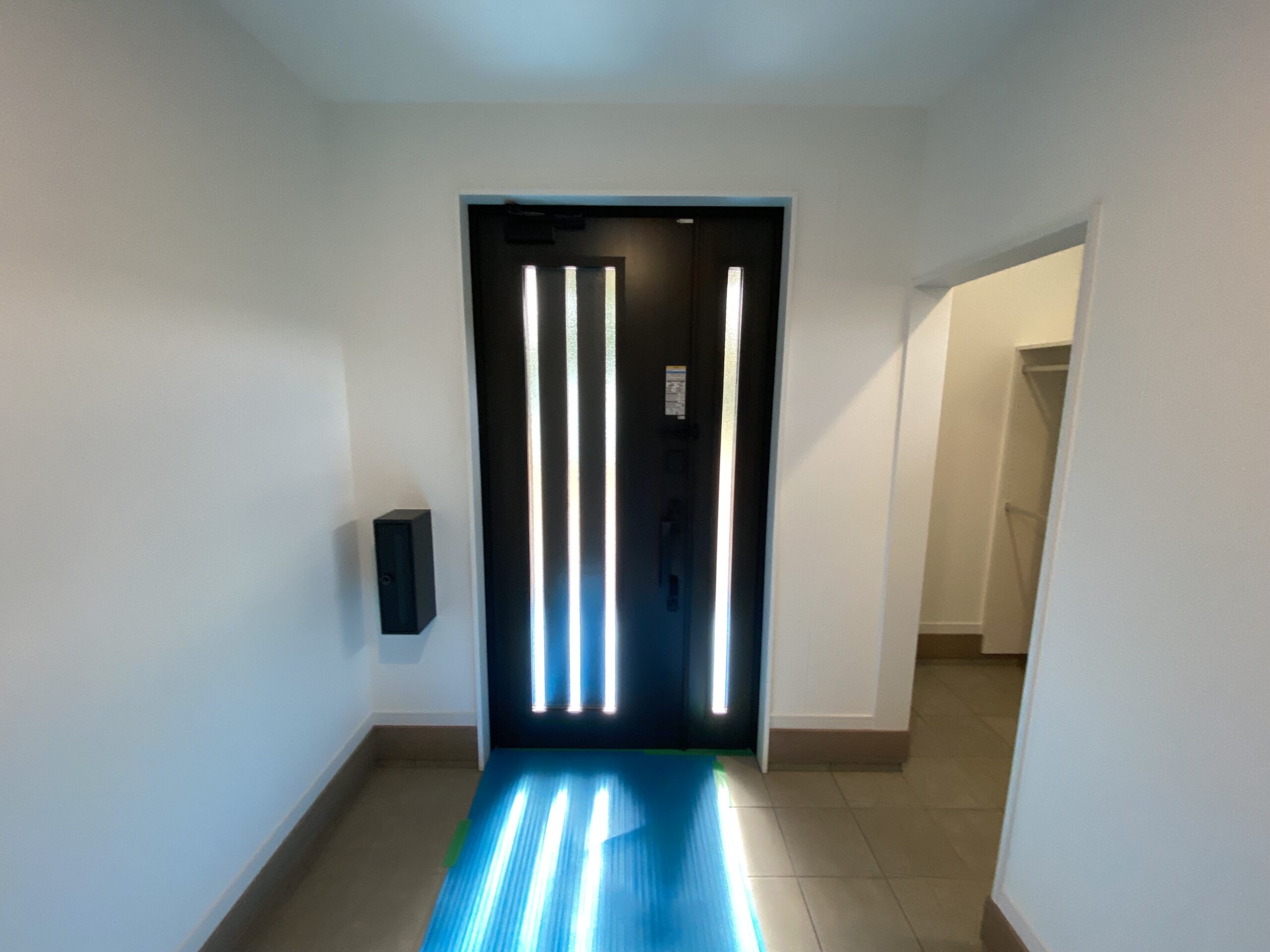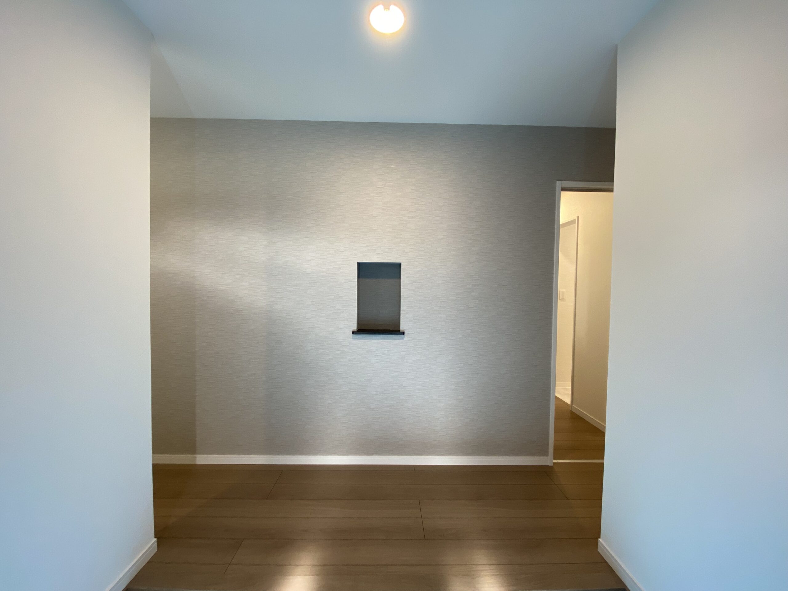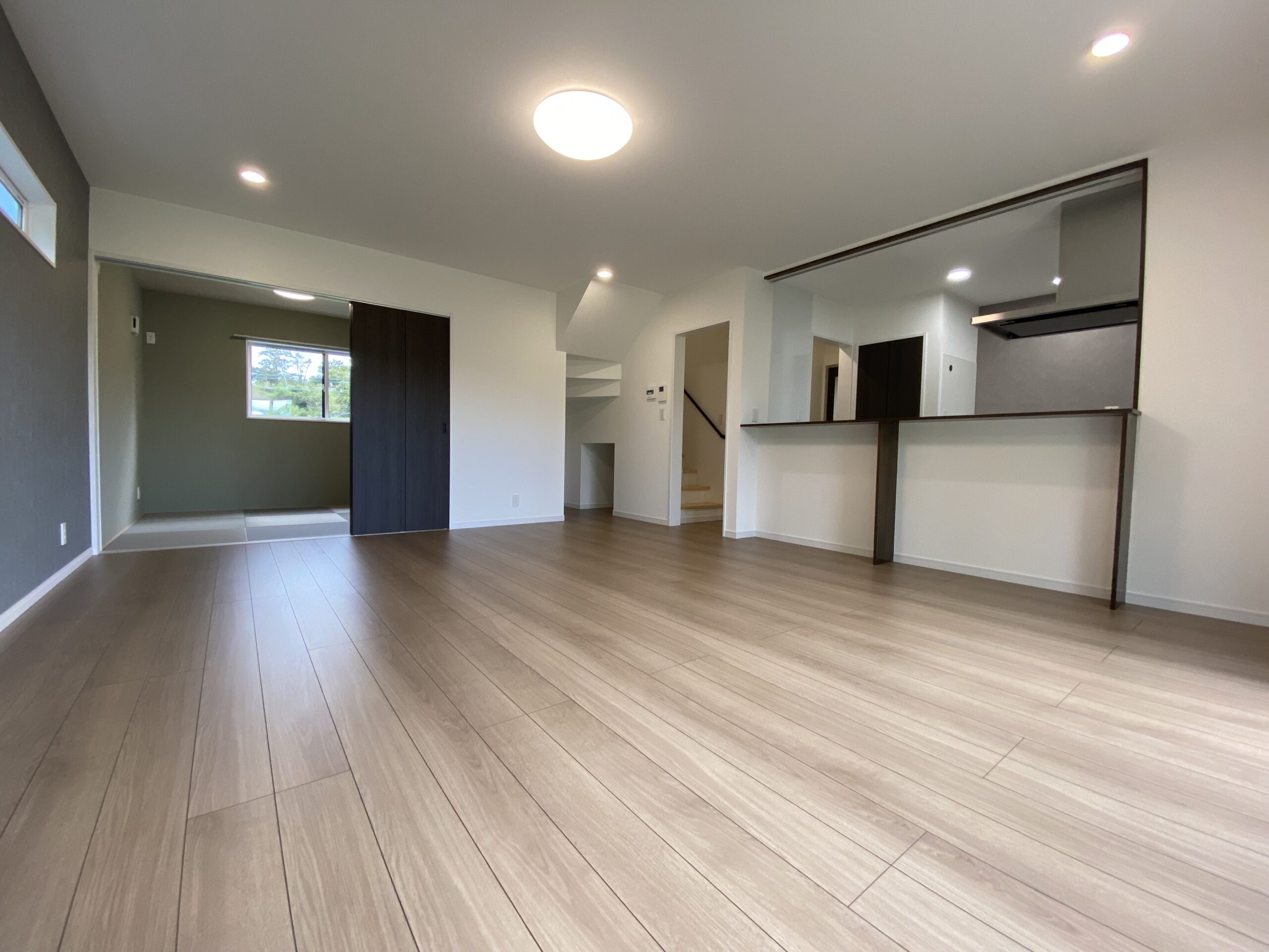 白を基調とした壁面に、ナチュラルな木目のフローリングが優しく馴染むリビングダイニング。 キッチンの腰壁にはダークカラーのアクセントを効かせ、空間を緩やかに引き締めました。 隣接する和室の扉を開放すれば、さらなる広がりを感じる大空間に。