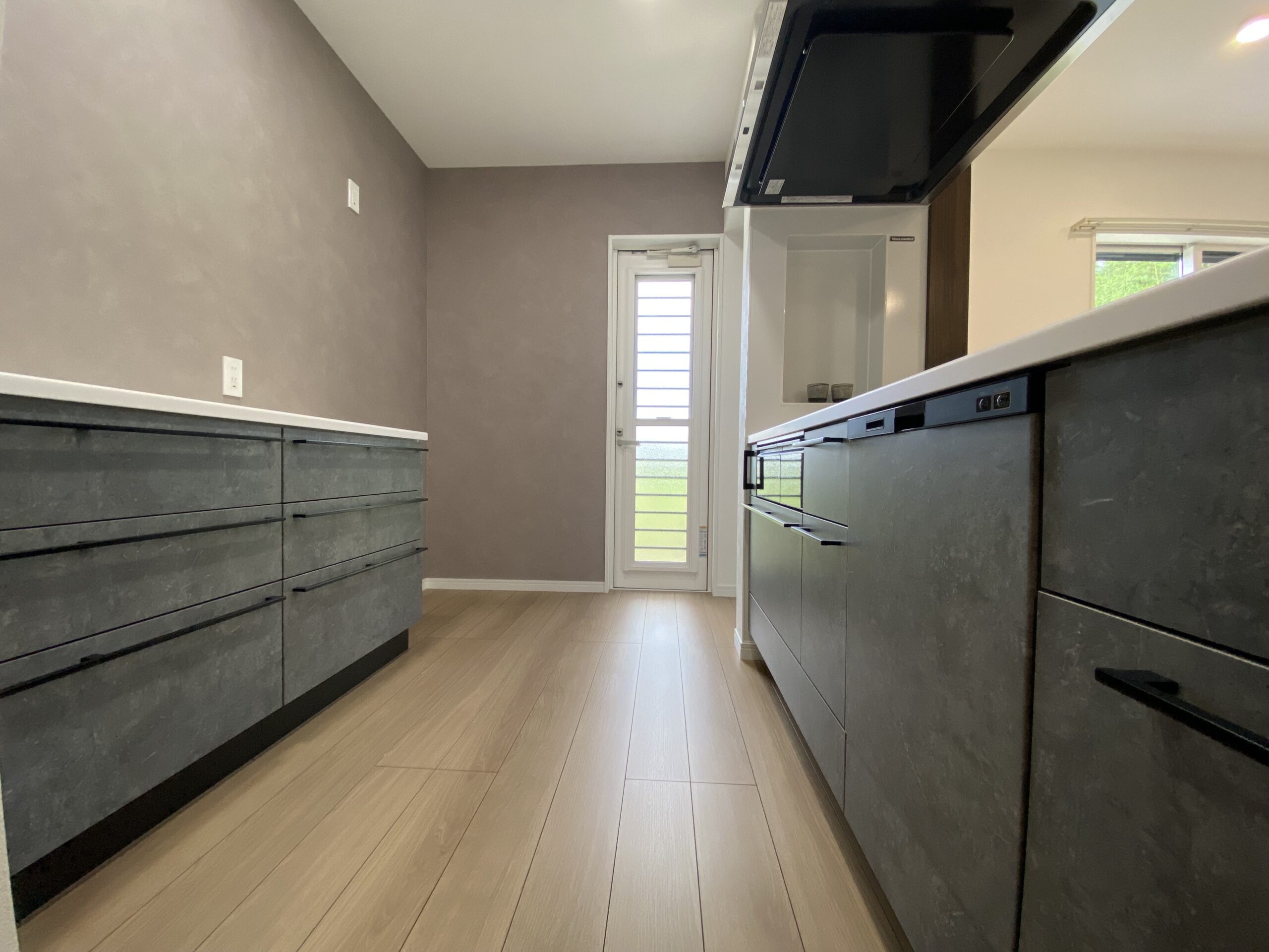 キッチン本体と背面のカップボードに、深みのある石目調のテクスチャを採用。 壁面のニュアンスカラーと相まって、空間全体に美しいグラデーションが生まれます。
